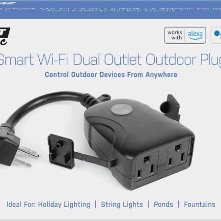 Smart Outdoor Plug, WiFi Waterproof Plug, 2 Grounded Sockets, Works with Alexa and Google Assistant, App Controlled, 15 Amp Indoor/Outdoor 2 Outlet Plug, Black, Plug/WiFi/WP